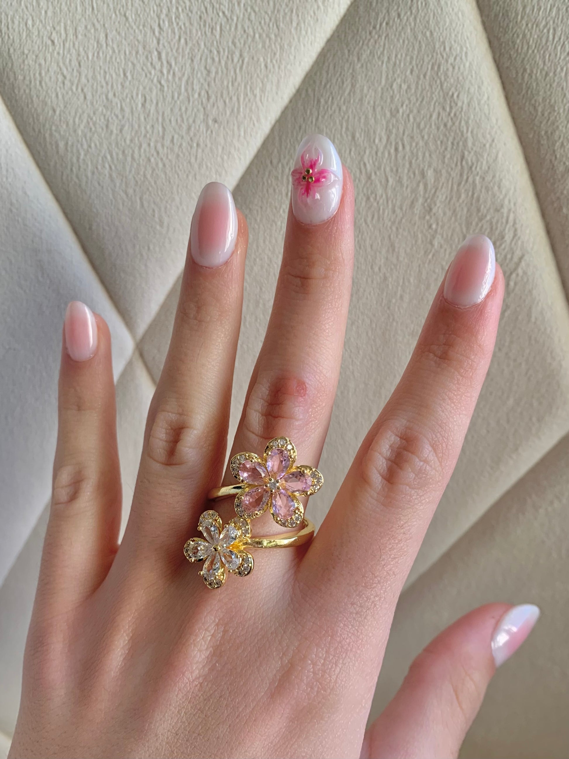 Un anillo que florece con cada movimiento. Bañado en oro 18k y decorado con dos flores de circon: una rosada y una blanca. Sweet Blossom es delicado y ajustable . Ideal para regalar, o para brillar con dulzura todos los días.