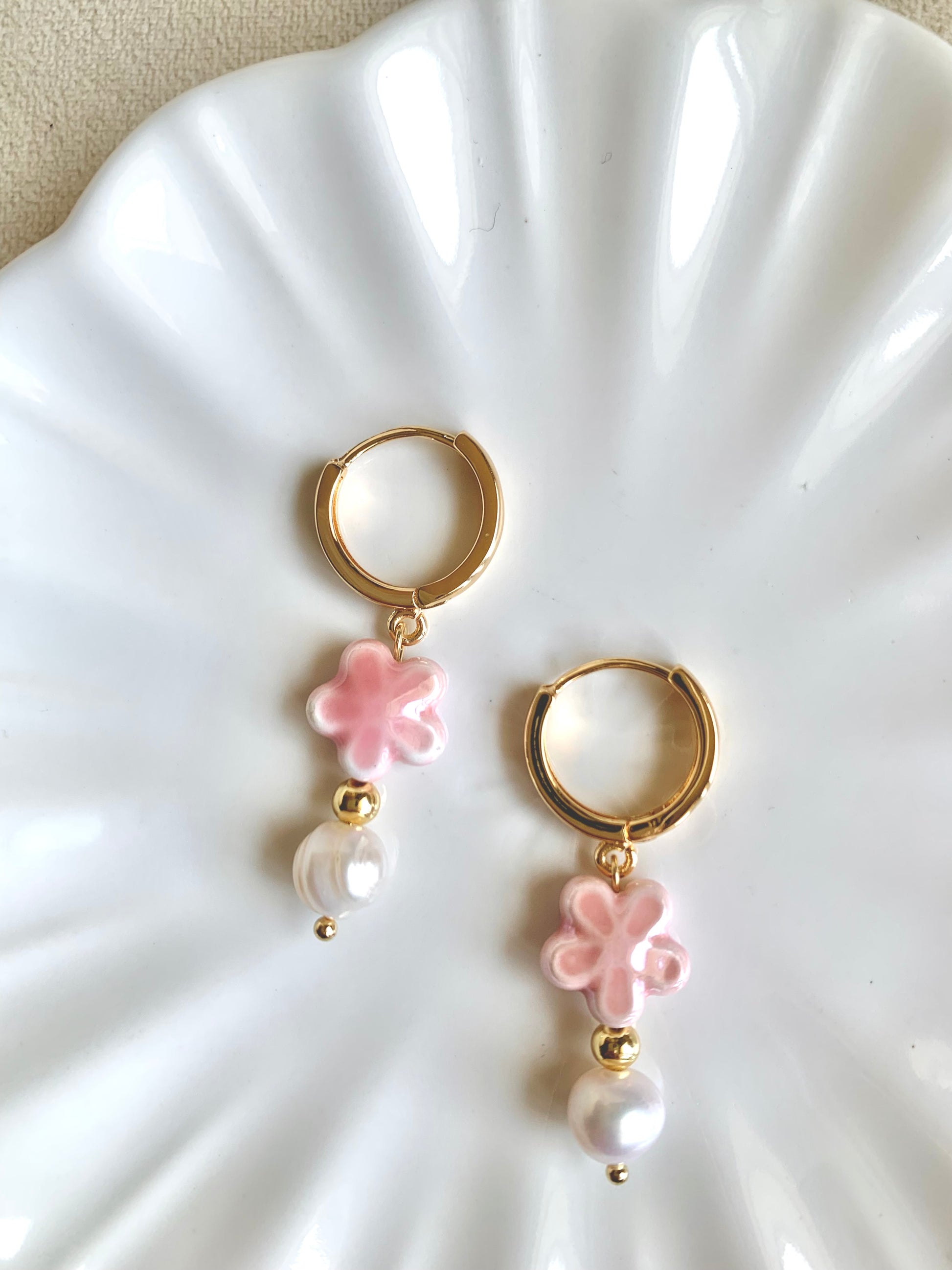 Diseñados con delicadas flores de cerámica esmaltada en rosa y una perla de río suspendida en cada aro.