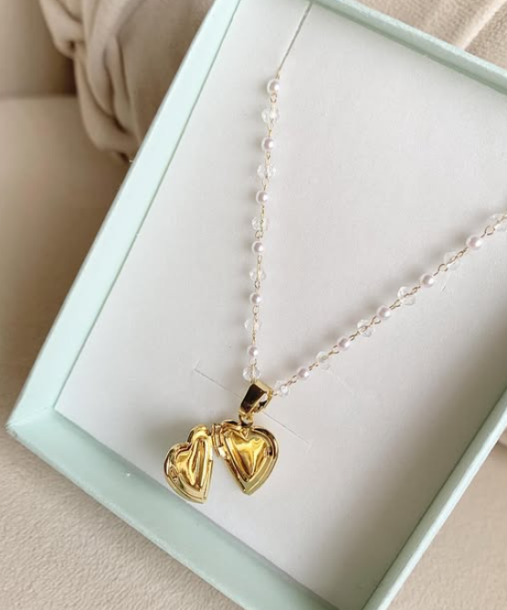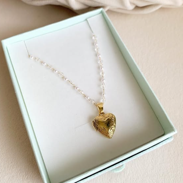 Un tesoro en miniatura que guarda encanto y significado. Este delicado relicario viene acompañado de una fina cadena adornada con perlitas y cristales brillantes, todo bañado en oro para un acabado luminoso y elegante.