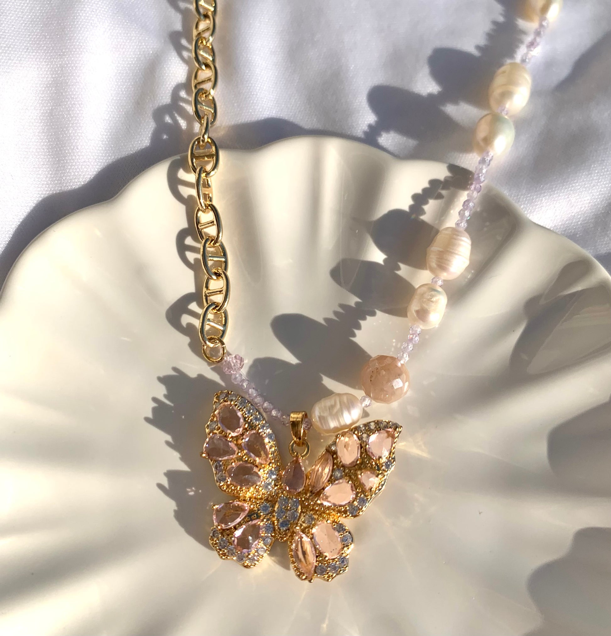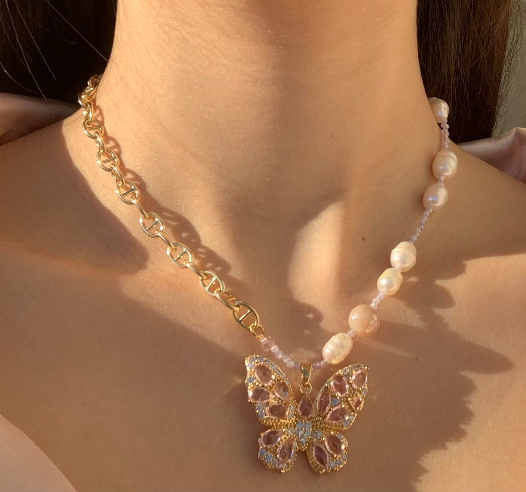 Confeccionado con mitad cadena bañada en oro y mitad compuesta por perlas de río naturales, circonitas lila facetadas y una piedra luna. Incluye un colgante central de mariposa con circones que aporta brillo y delicadeza al look.