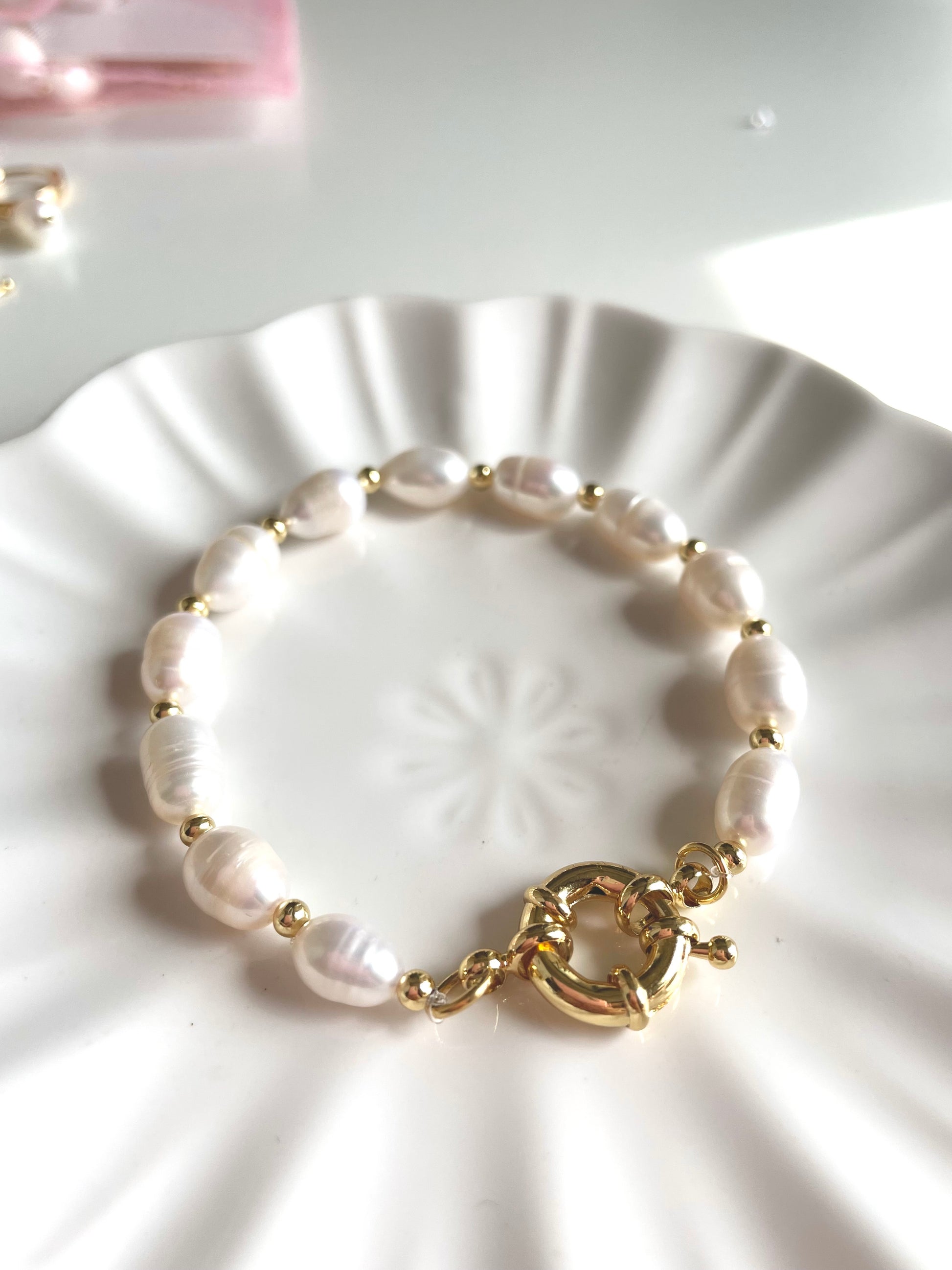Pulsera hecha con perlas de rio y detalles en baño de oro
